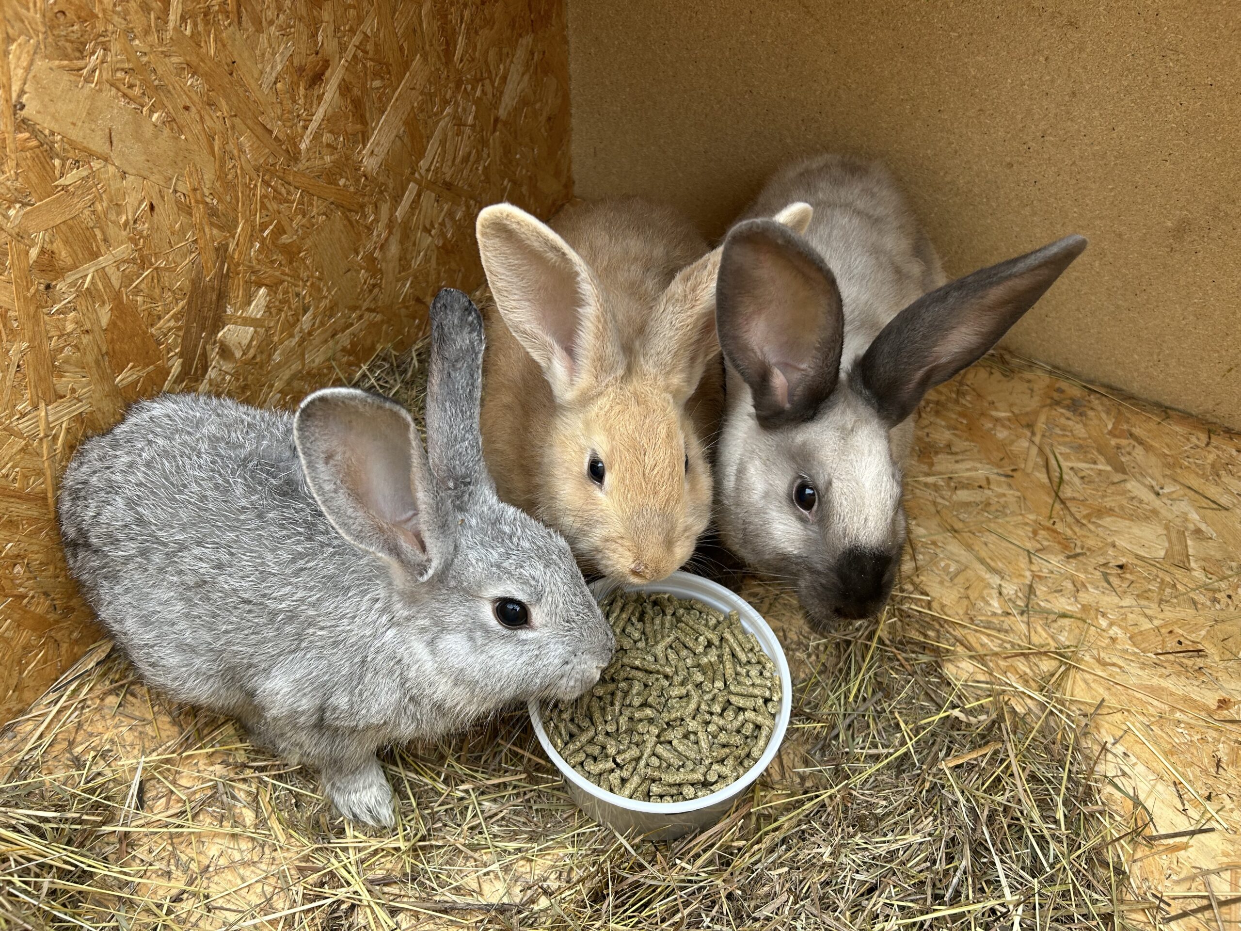 We raise red New Zealand/Götaland meat rabbits, a hardy and fast-growing breed known for its calm temperament, good mothering ability, and high-quality meat. These rabbits are well suited to small-scale, sustainable farming, producing up to six nests per year under attentive care. We have two mums who will have a nest in January, April and July. Their diet consists of a balanced mix of pellets and hay, supporting steady growth and overall health while ensuring consistent quality in both breeding and meat production.